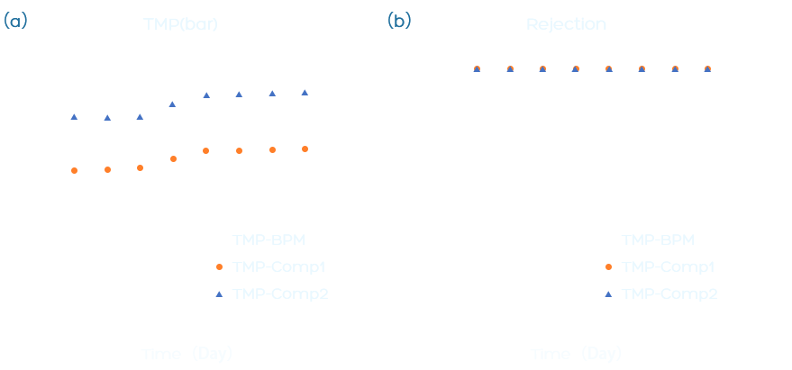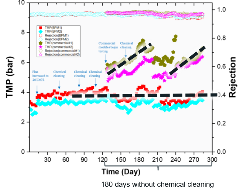 Fig. Plot of the transmembrane pressure and rejection against running time using UPWRP MBR permeate with two BPM-RO modules in series and two commercial modules under similar operating conditions.