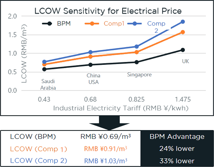 The Levelised Cost of Water (LCOW) was derived, and it shows the BPM-RO plant achieving significantly lower LCOW compared to other RO membrane plant.